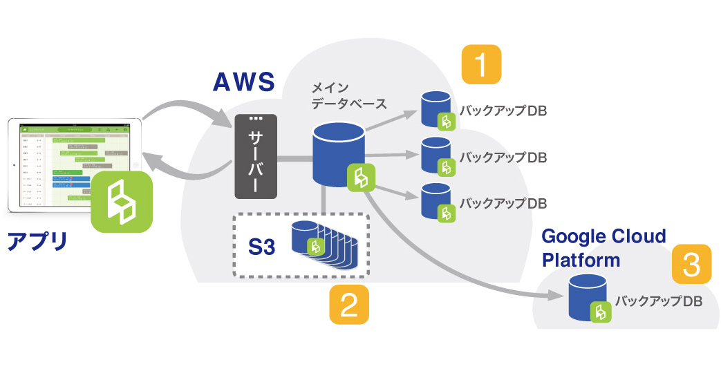 トレタのサーバーは、基本的にAWSで動いていますが、DBのコピーをGoogle社の提携する「Google Cloud Platform」にも作成しています。これにより、AWS全体で大規模な障害が起こってもデータを保全できる設計になっているので、完全にデータを消失してしまうことはありません。